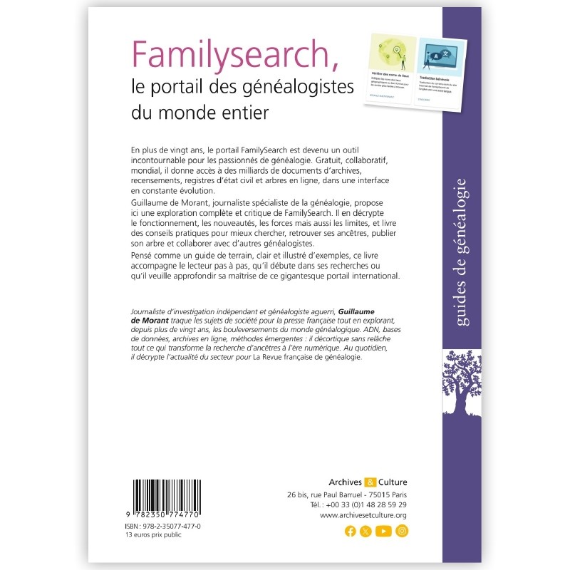 Guillaume de Morant, journaliste spécialiste de la généalogie, propose ici une exploration complète et critique de FamilySearch. Il en décrypte le fonctionnement, les nouveautés, les forces mais aussi les limites, et livre des conseils pratiques pour mieux chercher, retrouver ses ancêtres, publier son arbre et collaborer avec d’autres généalogistes.
