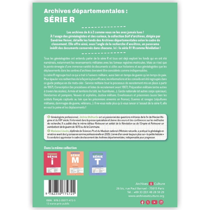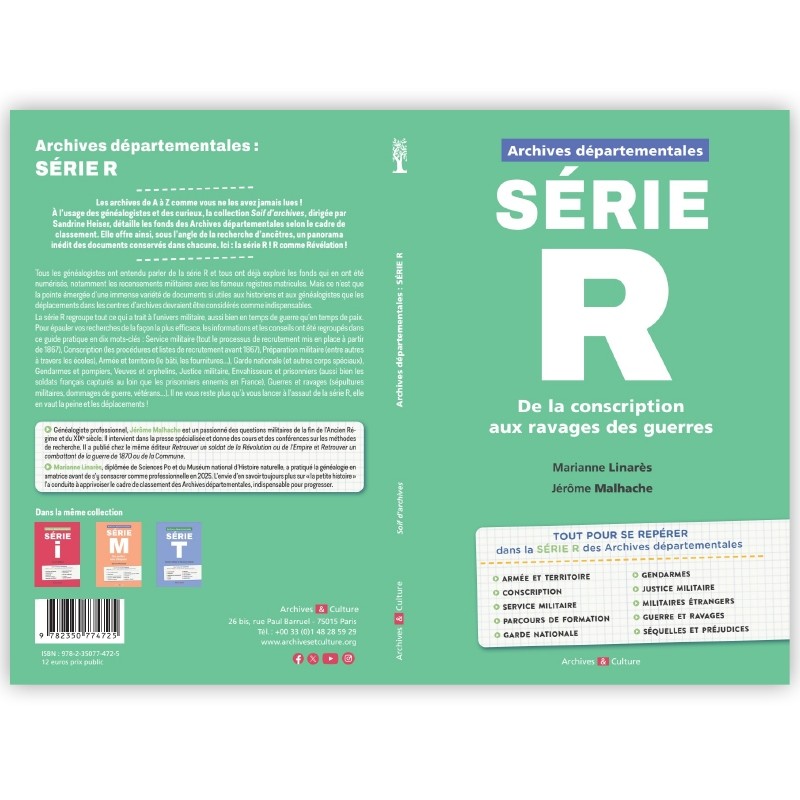 À l’usage des généalogistes et des curieux, la collection Soif d'archives, dirigée par Sandrine Heiser, détaille les fonds des Archives départementales selon le cadre de classement. Elle offre ainsi, sous l’angle de la recherche d’ancêtres, un panorama des documents conservés dans chacune et permet des recherches inédites. Ici : la série R !